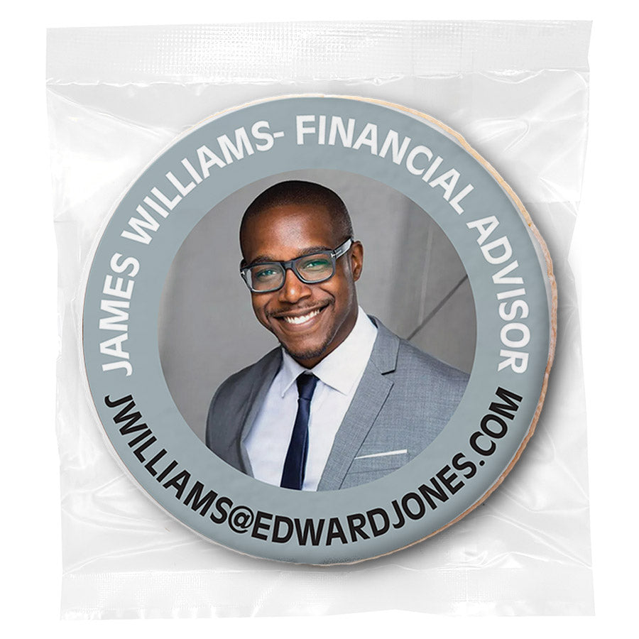 - Individually wrapped 3 inch custom-printed sugar cookies.