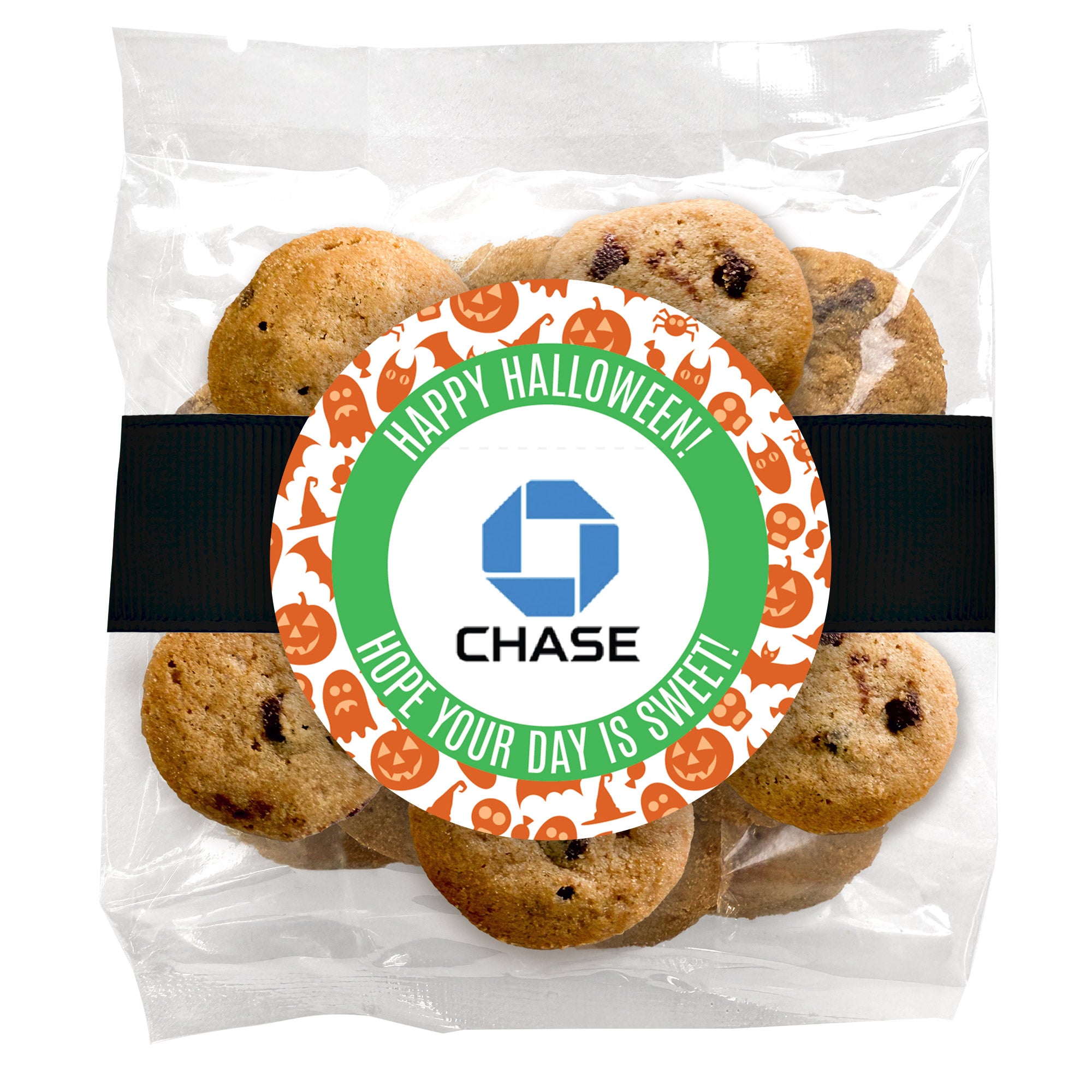 Bite-Sized Chocolate Chip Cookies (2 oz., approx. 14 cookies) W/ Full Color Custom Sticker - Happy Halloween Logo Upload