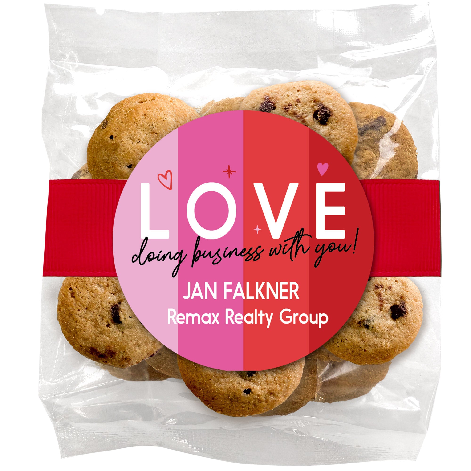 LOVE doing business with you - Bite-Sized Chocolate Chip Cookies (2 oz., approx. 14 cookies) W/ Full Color Custom Sticker & Ribbon