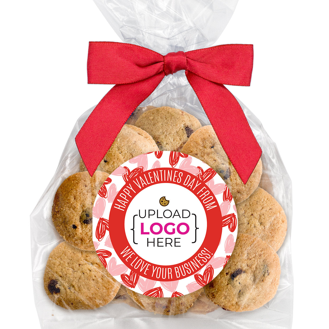Happy Valentines Day From Logo - Bite-Sized Chocolate Chip Cookies (2 oz., approx. 14 cookies) W/ Full Color Custom Sticker & Ribbon