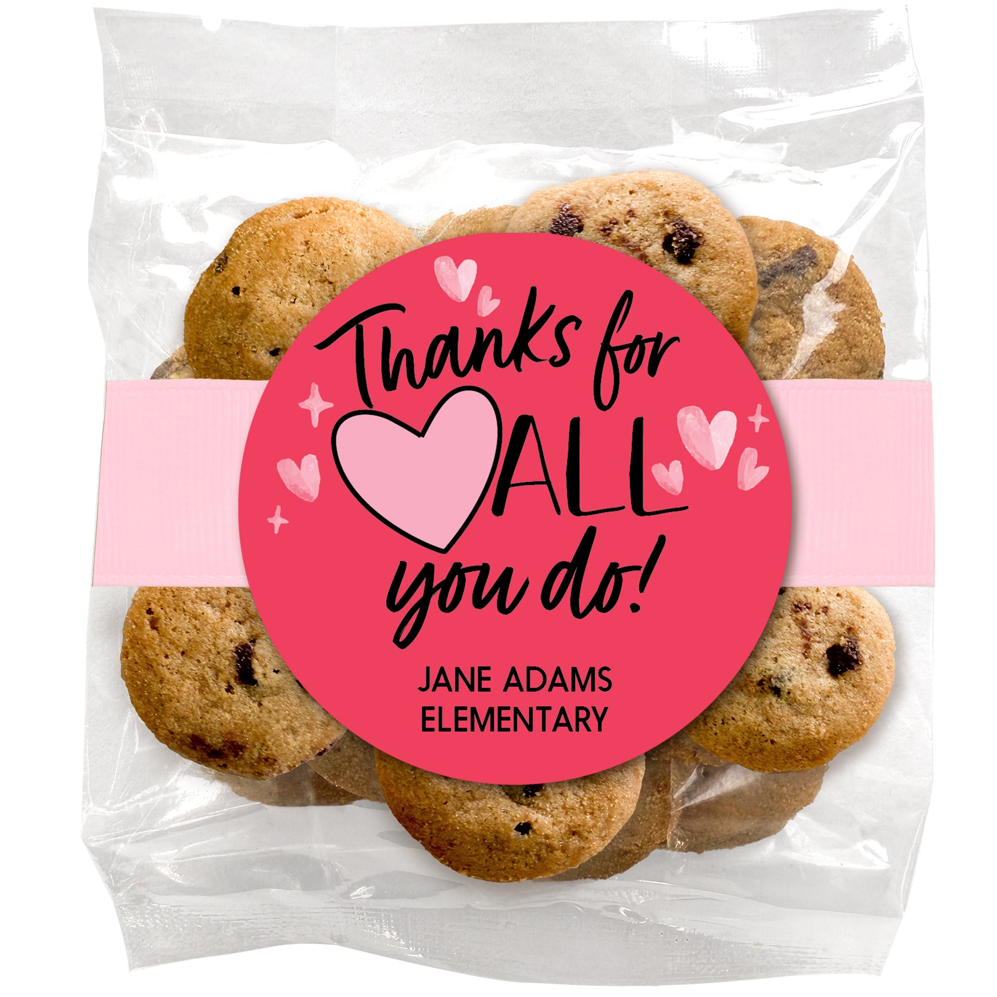 Thanks for all you do Valentines - Bite-Sized Chocolate Chip Cookies (2 oz., approx. 14 cookies) W/ Full Color Custom Sticker & Ribbon