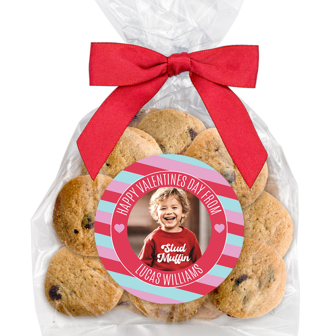 Happy Valentines Day Photo and Name Stripes - Bite-Sized Chocolate Chip Cookies (2 oz., approx. 14 cookies) W/ Full Color Custom Sticker & Ribbon