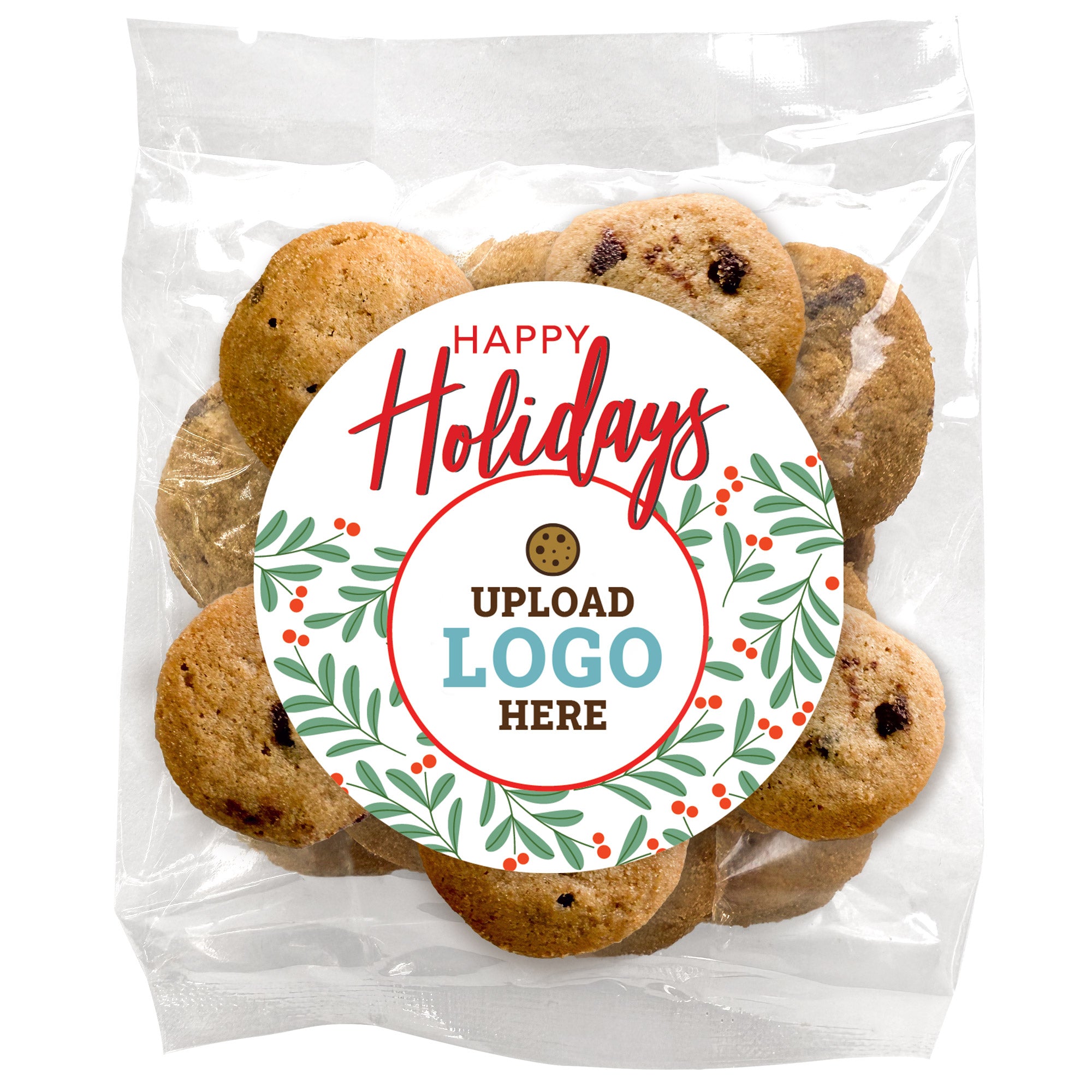 Bite-Sized Chocolate Chip Cookies (2 oz., approx. 16 cookies) W/ Full Color Custom Sticker - Happy Holidays Berry leaves Logo Upload