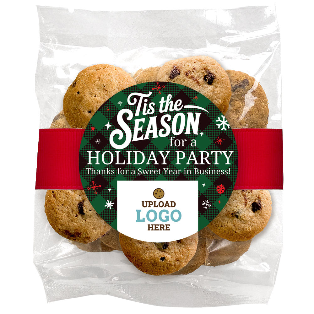 Bite-Sized Chocolate Chip Cookies (2 oz., approx. 16 cookies) W/ Full Color Custom Sticker & Ribbon - Tis' the Season for a Holiday Party Logo Upload
