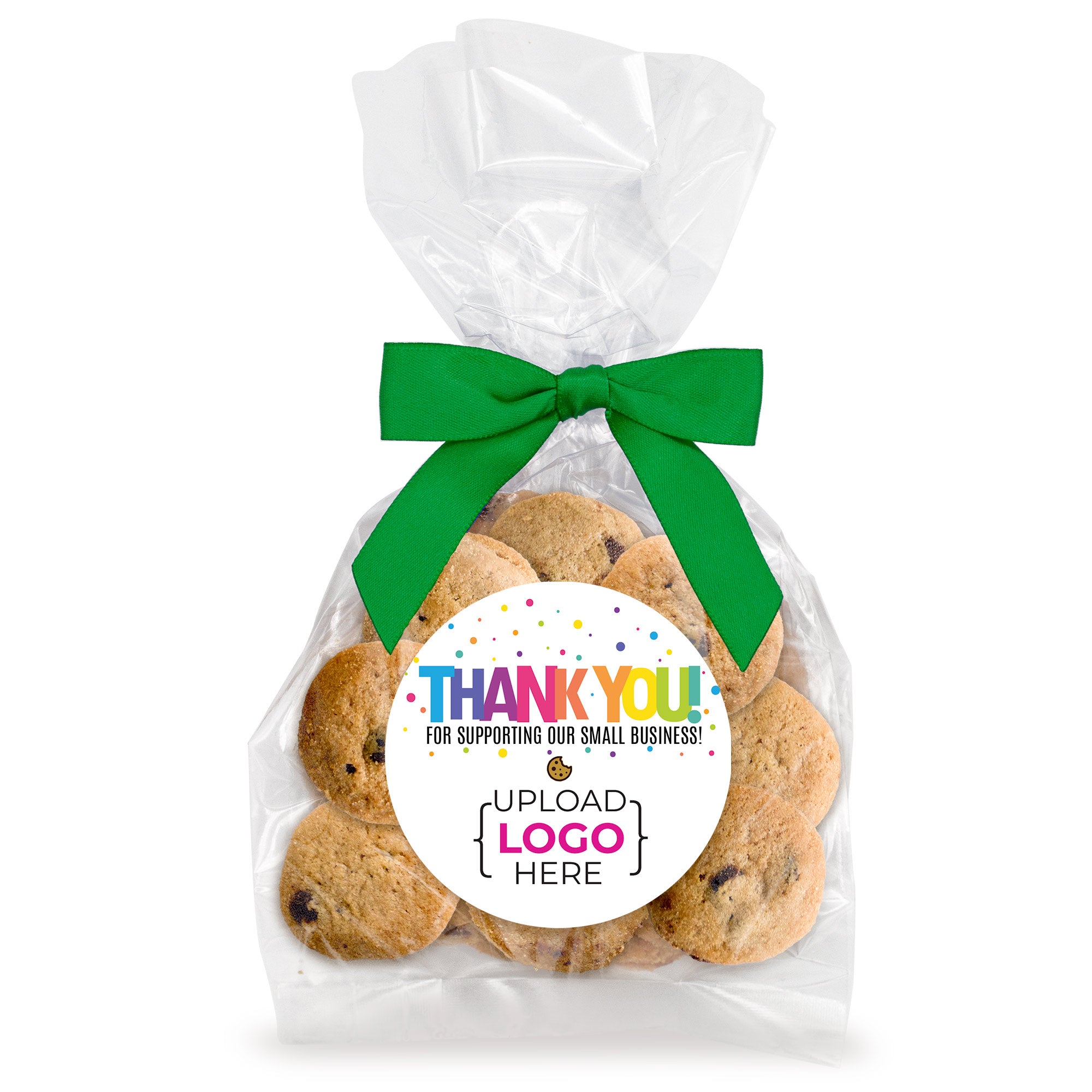 Bite-Sized Chocolate Chip Cookies (3 oz., approx. 21 cookies) W/ Full Color Custom Sticker & Bow Choice - Colorful Thank You Logo Upload
