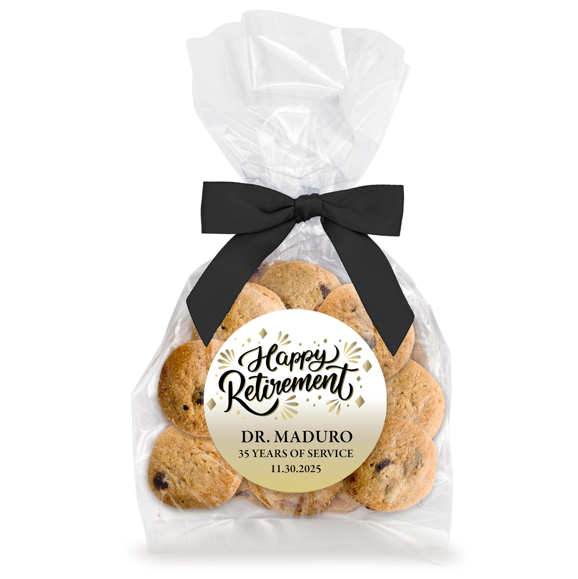 Bite-Sized Chocolate Chip Cookies (3 oz., approx. 21 cookies) W/ Full Color Custom Sticker & Bow Choice - Happy Retirement Gold and Black